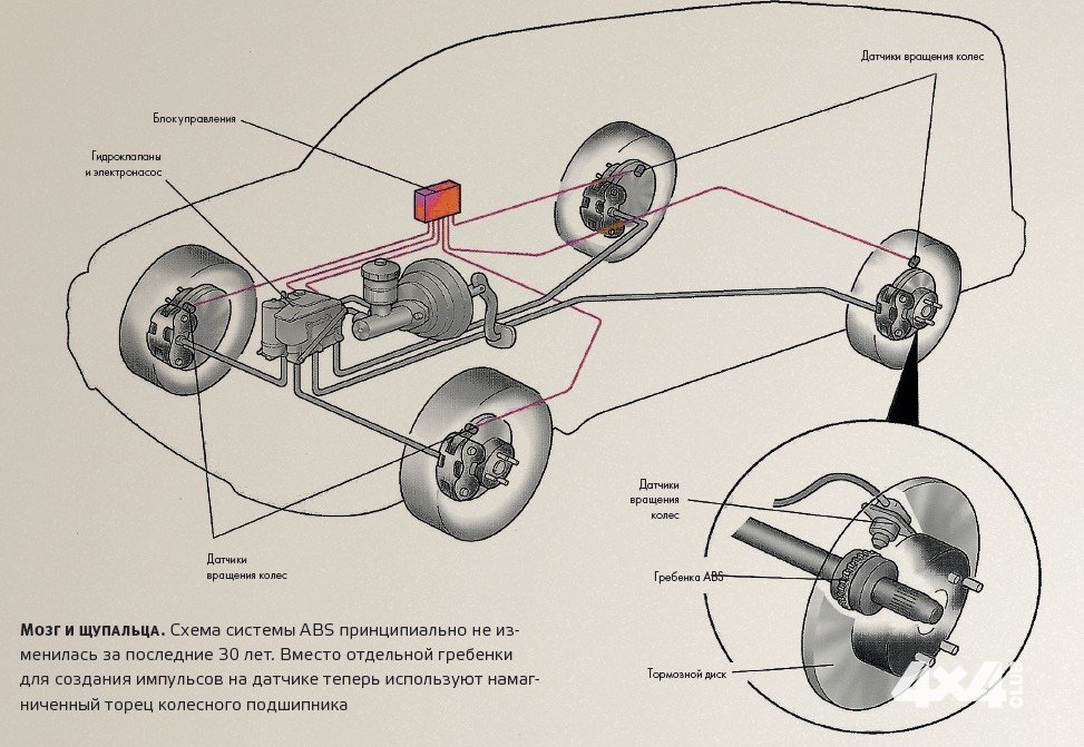 Зима, гололёд, скорость 60 км/ч. Нажимаем на педаль тормоза и слышим знакомое стрекотание системы ABS. Что происходит в этот момент? Если вы чувствуете импульсы на педали, привычный стрекот или жужжание, то это означает, что на какие-то микросекунды из тормозной магистрали того или иного колеса пропадает давление, которое вы развиваете нажатием ноги на педаль. Антиблокировочная система, которую раньше ещё называли антиюзовой, по отсутствию сигналов с датчиков вращения колес заметила, что колесо перестало крутиться и разжало его тормозные колодки. Главная цель – не дать автомобилю уйти с выбранной траектории, и тем более – развернуться. Вроде бы прописные истины, но есть тонкости.