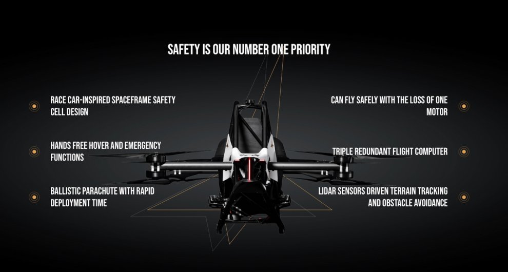 Есть и несколько функций безопасности, которые возможно помогут вам избежать неприятностей. Это лидарные датчики для облёта препятствий, такие же как на автономном Mercedes S-Class, функция автоматического управления для чрезвычайных ситуаций, а также быстросъёмный парашют. И наконец, в «Джетсон» утверждают, что машина весом 86 кг способна безопасно летать, даже если один из её двигателей выйдет из строя.