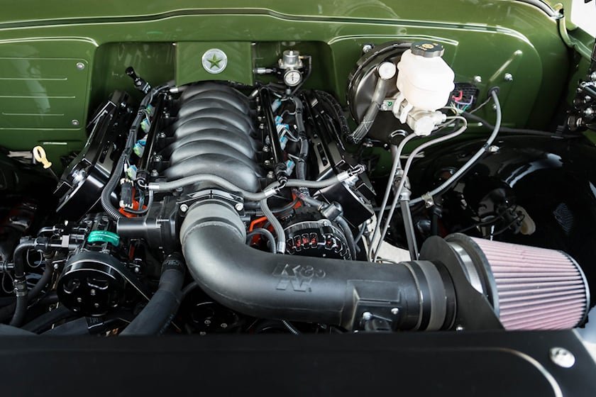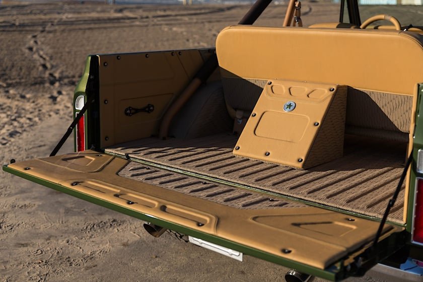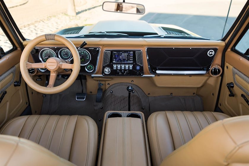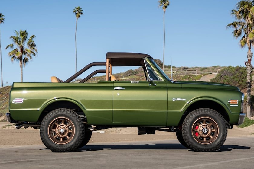 Кузов Blazer K5 покрыт великолепным оттенком Growler Green, идеально подходящим для закатных прибрежных круизов. С ним отлично контрастируют окрашенные в бронзу 18-дюймовые колёсные диски от HRE. Среди других стильных штрихов уникальная фирменная маркировка Ringbrothers и сделанная вручную крышка топливной горловины.