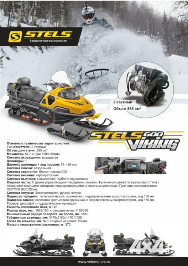 На базе хорошо зарекомендовавшей себя модели STELS Росомаха, компания ВЕЛОМОТОРС выпустила новый снегоход VIKING 600 с 2-х тактным двигателем 565 куб.см. с воздушным охлаждением.
