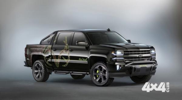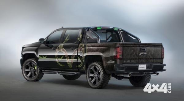 Второй концепт называется Silverado Realtree с оригинальным рисунком на кузове. На таком автомобиле можно смело отправляться на отдых, природу и в экстримальные загородные путешествия. Стоит автомобиль на больших 22-дюймовых колесах, сквозь которые видны салатовые тормозные суппорта. На переднем бампере также установлен «толкатель». Пикап, разумеется, полноприводный, а под капотом стоит 6,2-литровый 425-сильный V8.