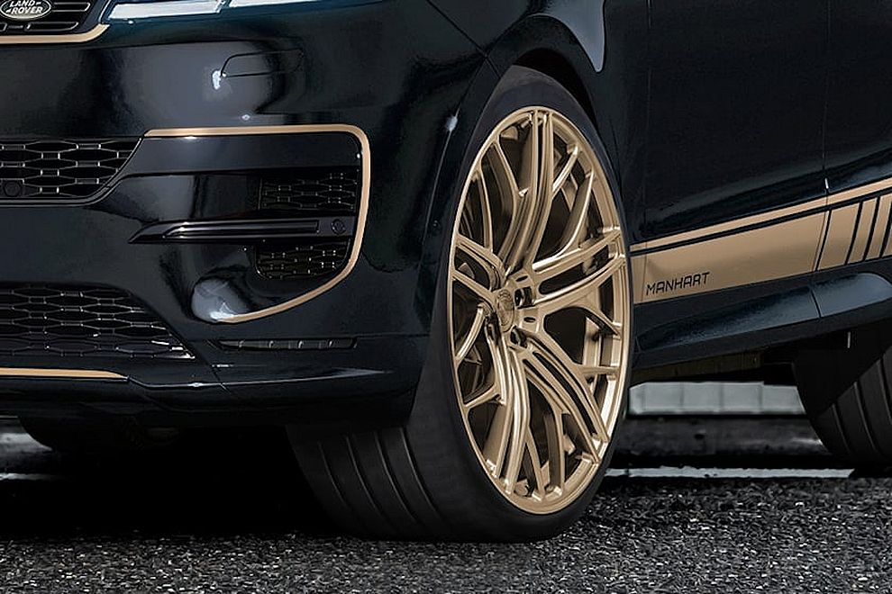 Однако внешние изменения скорее всего вызовут значительно больше разногласий, и золотые акценты Manhart многим покажутся неуместными. При этом, вы не найдёте здесь шильдиков Land Rover или Range Rover. Нет, Manhart заменил все названия своими собственными, которые, конечно же, отделаны золотом. Наконец, чёрный цвет кузова подчеркивают 24-дюймовые литые диски Forged Line, выполненные в фирменном золотом цвете. Возможно, Manhart предложит и другие цветовые решения (как уже не раз бывало), если покупателю не понравится его оригинальный дизайн.
