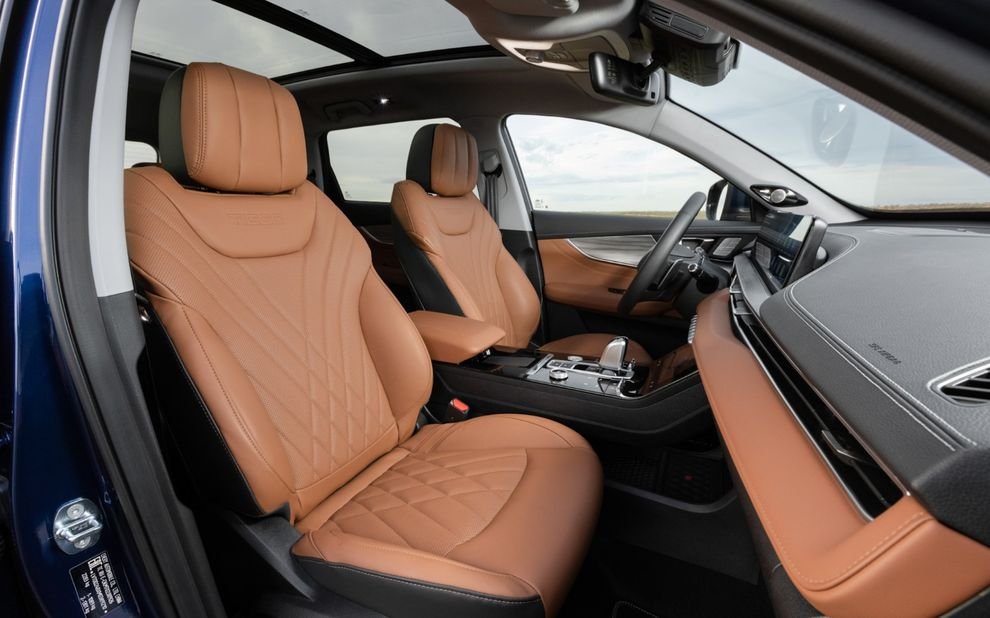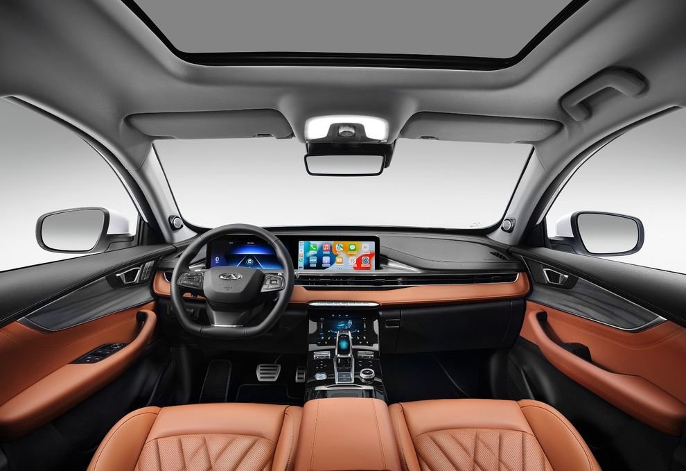 Коричневый салон, который мог бы быть и потемнее, отделан высококачественными материалами, а передние кресла снабжены функциями обогрева и вентиляции. Сдвоенные экраны, диагональю по 12,3 дюйма каждый, объединяют приборную панель с мультимедиа. При этом на приборной панели отображаются данные об уровне заряда батареи, режиме движения, рекуперации, спидометр, тахометр, давлении в шинах, расходе топлива и многое другое, а мультимедиа поддерживает Android Auto и Apple Carplay. Для управления климатом, обогревом и вентиляцией передних сидений, предусмотрен отдельный сенсорный экран, расположенный на центральной консоли. В TIGGO 8 PRO e+ стоит акустика от Sony, звучание которой подчёркивается объёмом, который создают восемь динамиков. Не много, но, в целом, достаточно.