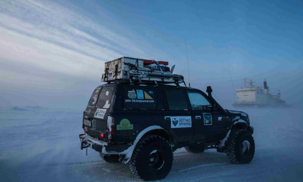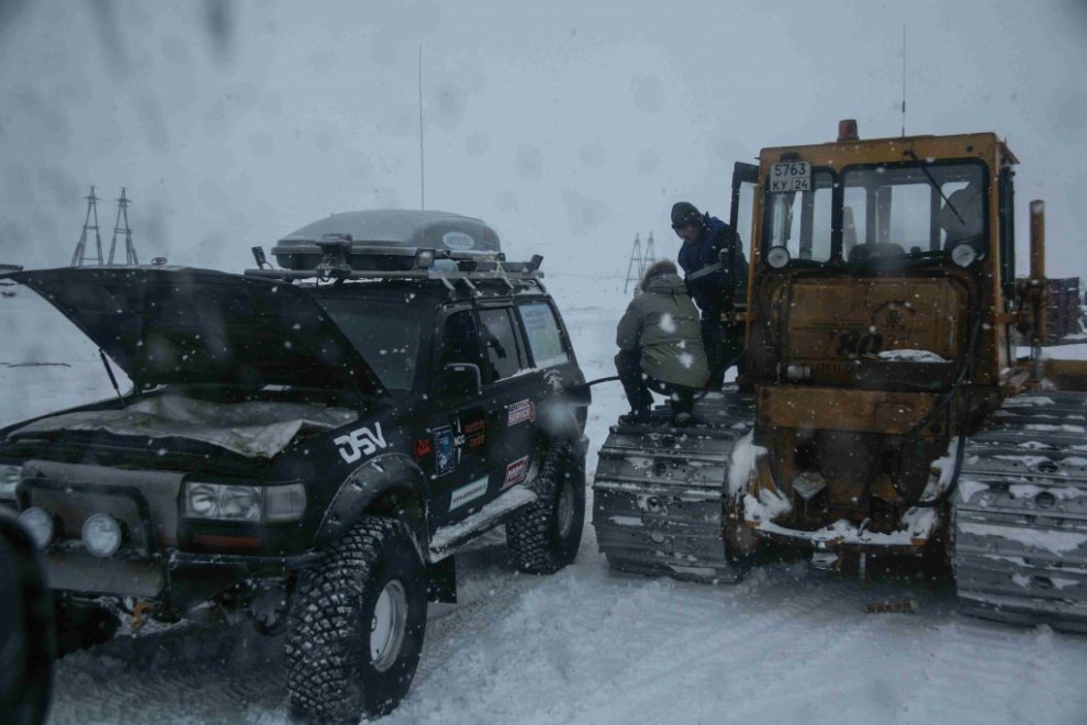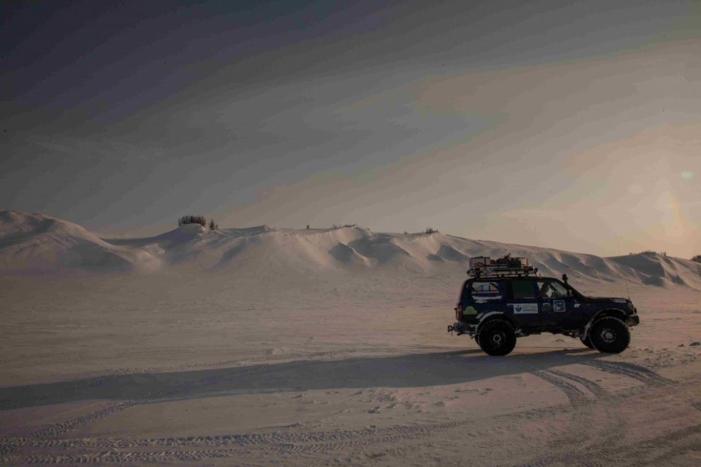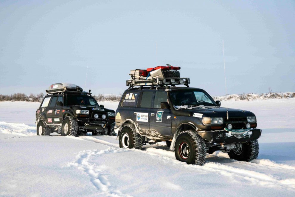 Любая, даже самая незначительная поломка, на сильном морозе превращалась в огромную проблему. Ведь мы старались не выходить лишний раз из машины, не только для приготовления еды, но даже подышать обжигающим морозным воздухом. Круглосуточные пробеги, езда по ночам. Привыкшие к поездкам в более комфортных климатических условиях, мы узнали много нового, и были слегка шокированы. И хотя большую часть пути мы провели в машине, подхватить арктический вирус успели. Осложнения не заставили себя ждать. Началось всё с пересмотра концепции подготовки внедорожника, который постепенно стал превращаться в экспедиционник для арктических маршрутов. В дальнейшем это превращение полностью исключило его использование в летний сезон. Первая проверка наших технических решений прошла на Югорском полуострове, на маршруте в посёлок Амдерма. Самым заметным внешним изменением стали покрышки низкого давления исландской Arctic Trucks (38”), потому что они предназначены для обычных автомобилей, а не вездеходов, и на них можно ездить как по асфальту, так и по снегу. Но главное преимущество в том, что они спускаются до 0,15 атм, в результате чего каждое колесо даёт пятно контакта площадью до 0,16 м2 (40х40 см), что позволяет двигаться по насту. А на стандартном давлении (2 атм) можно ехать по асфальту со скоростью до 120 км/ч. Конечно, такой размер потребовал серьёзных переделок и ночёвок в гараже, но результат того стоил. Были установлены подогревы всего, что только можно подогреть: топливного фильтра, топливных баков, автономный отопитель двигателя (для экономии на случай долгой стоянки), автономный отопитель салона (для тех же целей), подогреватель топливной магистрали от системы охлаждения, системы вентиляции картерных газов... И раз уж речь зашла о тепле, было сделано тотальное утепление салона. Установлены утеплители на окна, сшиты специальные чехлы для радиатора (понадёжнее картонки будет), специальным чехлом закрыто днище двигателя, что защищает от выдувания тепла и попадания снега. Дополнительно, в экспедиции команда укомплектовывается или специально сшитым чехлом на автомобиль, или парашютом для защиты от ветра при длительных стоянках и ремонтах.