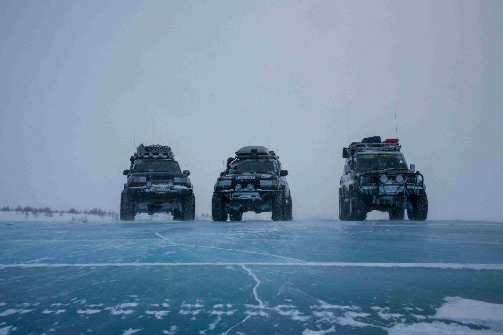 Закончив арктический тюнинг, мы собрались на Диксон. Идея попасть туда появилась ещё после экспедиции в Амдерму. Тогда показалось логичным поехать в следующий порт Северного морского пути. Когда же начали собирать информацию по маршруту, то поняли, что там не то что нет дорог (к этому мы привыкли), но и на автомобиле туда ещё никто не ездил. Подготовка началась в сентябре и велась по всем направлениям: адаптация автомобилей, сбор информации о местности и прокладка маршрута, договорённости о топливе, оформление пропусков и разрешений (Диксон и Якутия – приграничные зоны, а Норильский промышленный район вообще отдельная тема). Кроме того, мы собрали опытную команду. Экипаж из Эстонии, который изъездил весь Север вдоль и поперёк и обладал внедорожником для таких путешествий, и не менее опытные ребята из Перми, тоже не новички на северных маршрутах, с автомобилем соответствующей подготовки. Кстати, для нас это был первый опыт путешествия с людьми, которых мы впервые увидели на старте и опыт этот оказался удачным. В середине февраля в Сургуте мы пожали друг другу руки – следующие тридцать два дня и десять тысяч километров мы проведём вместе. Первым делом нужно было найти путь с Ямала на Таймыр, ведь наша цель таймырское Южно-Соленинское месторождение. Звездой этого отрезка маршрута стал наш штурман Алексей Тузов, который провёл большую предварительную работу с картами и всегда знал, куда ехать. Не без помощи людей, занятых освоением недр, мы попали на речку Мессояху, по которой и планировали выйти на Таймыр. Мы едем по снежной целине, ориентируясь только на карту и берега. Впереди нет ни колеи, ни следов.