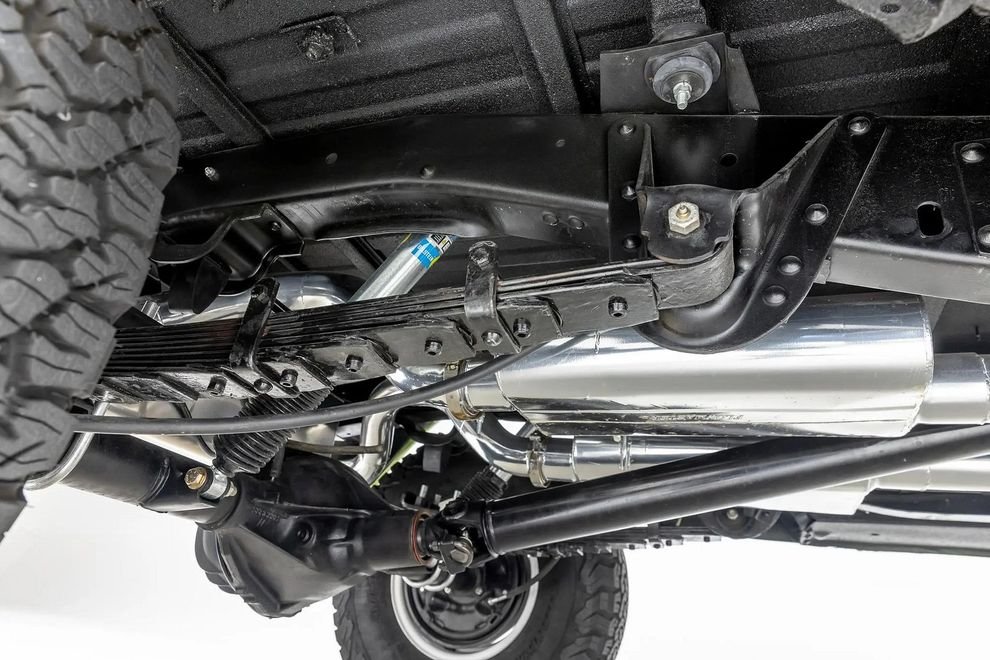 Данных о мощности этой конкретной машины у нас нет, но по заявленным заводским параметрам LS7 выдаёт 570 лошадиных сил и 732 Нм крутящего момента. Вся эта мощь передаётся на колёса через четырёхступенчатую автоматическую коробку передач 4L80E и двухступенчатую раздаточную коробку NP205. Кроме того, в процессе модернизации был установлен впускной коллектор Edelbrock, новые топливные магистрали и алюминиевый радиатор с электрическими вентиляторами, а также двойная выхлопная система с глушителем Flowmaster.