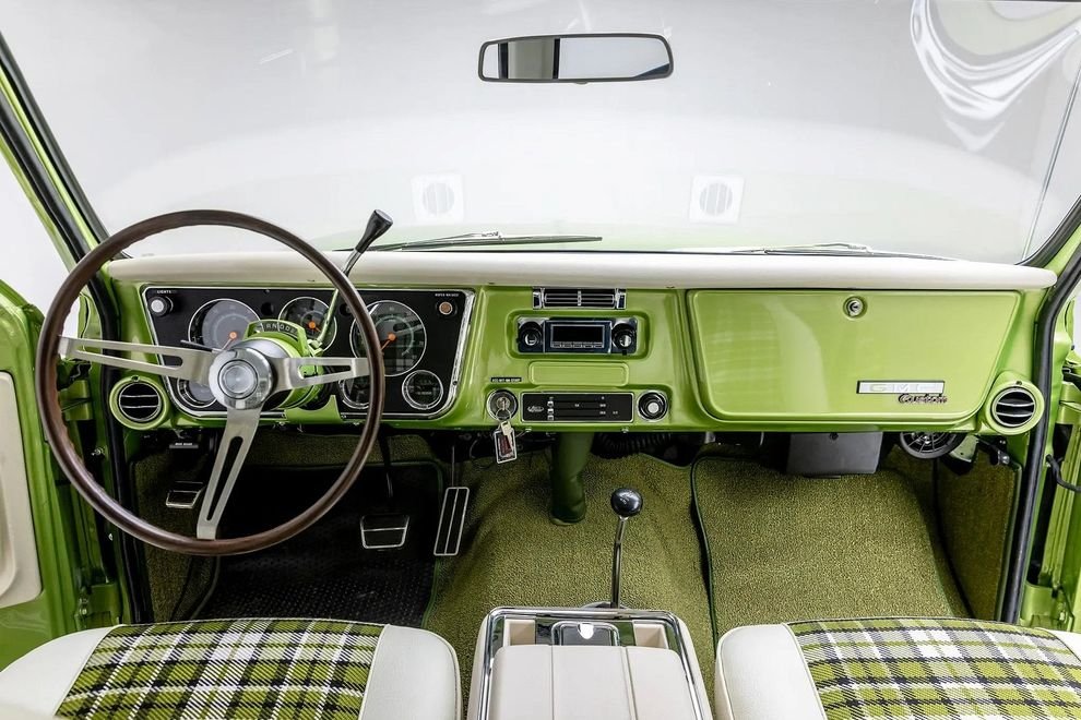 Трансформация продолжилась внутри: передние ковшеобразные сиденья и задний диванчик обтянули белым винилом с зелёными клетчатыми вставками. Звуком занималась Dakota Digital instruments – любимой фирма классических рестомодов. Теперь Jimmy может похвастать не только уникальной аудиосистемой, но и мощным сабвуфером. Осталось только выбрать маршрут.