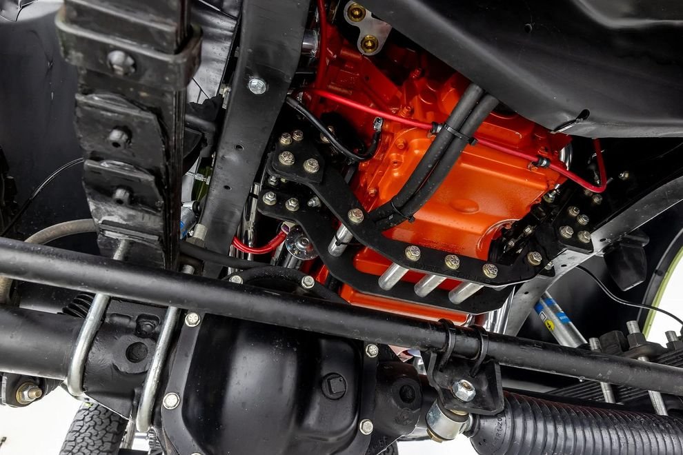Кузов Jimmy покрашен в зелёный металлик, со светодиодной оптикой по кругу, включая яркие светодиодные фары Holley Retro Bright. Для будущих офф-роуд приключений на внедорожник установили 2,5-дюймовый лифт, амортизаторы Bilstein, листовые рессоры Off Road Design, блокировки передних ступиц Warn и белые 15-дюймовые стальные диски, с шинами BF Goodrich All-Terrain T/A. Надёжное торможение обеспечивается передними дисковыми тормозами с усилителем и задними барабанами.