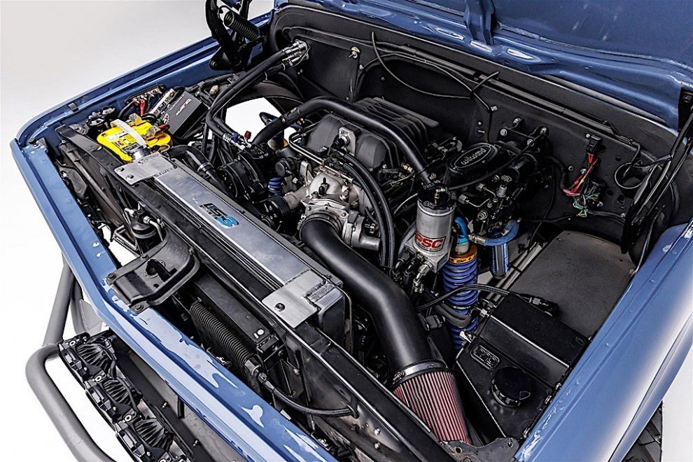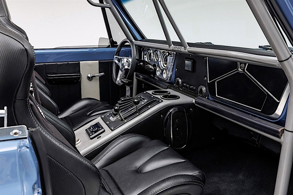 В этой лавине восстановленных «Бронко» приятно видеть похожий автомобиль, но с совершенно другим логотипом, отличающимся от синего овала. Перед вами Chevrolet K5 Blazer, который, как вы знаете, давно не производится компанией с галстуком-бабочкой на радиаторной решётке, зато тюнинг-ателье всегда готовы построить из них нечто грандиозное. Этот автомобиль был собран ещё в 2020 году, командой называющей себя Rock Bottom Off-Road. Кузов окрашен в светло-синий, который очень идёт K5. Машина выглядит очень мощной и неплохо подготовленной к бездорожью, благодаря своей необычной подвеске, множеству фонарей, установленных поверх рамки лобового стекла, и каркасу безопасности, охватывающему весь салон.