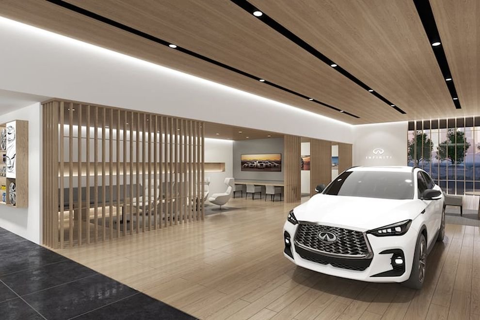 «Нашей целью было слегка доработать логотип, в поддержку новой яркой главы, которая ждёт нас впереди» – сказал Альфонсо Альбайс, вице-президент по глобальному дизайну. «Делая акцент на том месте, где бесконечная дорога пересекается с горизонтом, мы демонстрируем наше неизменное желание смотреть в будущее». Надо сказать, что в целом новый логотип и надпись Infiniti очень похожи на самый первый дизайн, который появился в 1989-м. Однако помимо эмблемы, бренд решил обновить свои дилерские центры по всему миру. Новая «розничная архитектура» придаст шоу-румам «чистый вид и наполненный светом интерьер». Тут Infiniti опирается на японское наследие и использует концепцию «Ма» – философию пространства между вещами. В отличие от модного сегодня минимализма, этот дизайнерский приём «использует пустое пространство, как дополнение к предметам» (при необходимости, вы можете прочесть этот текст ещё раз). Говорят, это создаёт баланс между всеми элементами, в рамках общего пространства. На линии крыши автосалонов будет большой карниз, препятствующий попаданию прямых солнечных лучей и целенаправленно создающий тени.