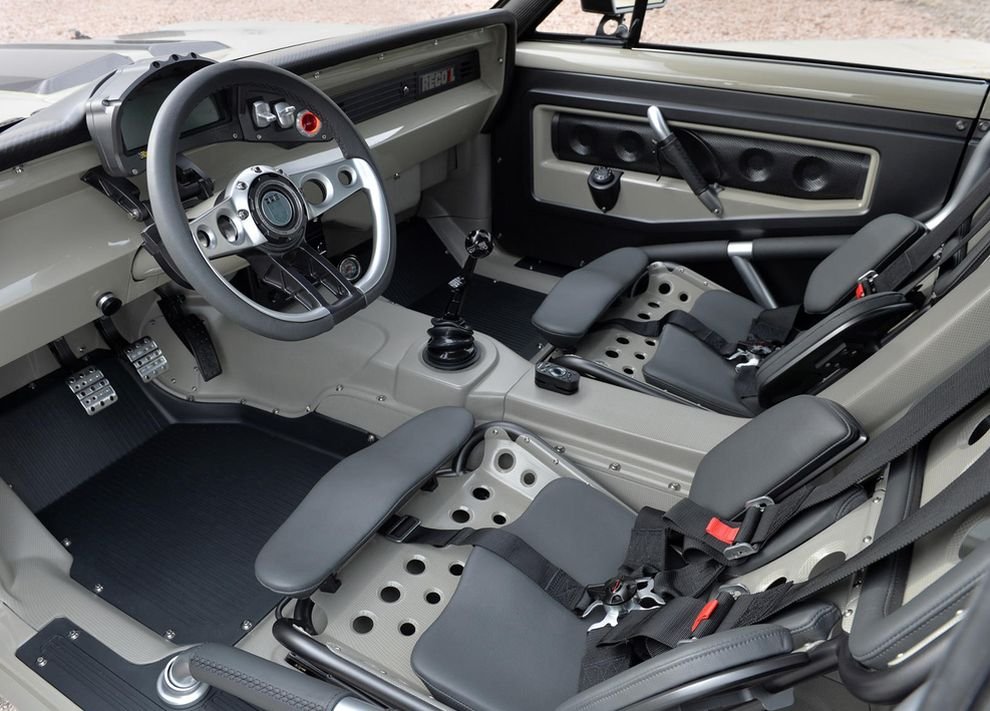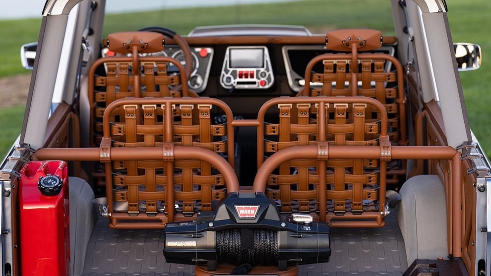 Радикально переосмысленный интерьер полностью переработан. Переднюю панель разделили на три сегмента, а на сиденьях натянули кожаные ремни, в результате чего они напоминают дачные стулья. При этом приборная панель и рукоятки рычагов являются уникальными деталями, сделанными специально для этого проекта, как и рулевое колесо из углеродного волокна, а великолепная лебёдка Warn Zeon заняла большую часть грузового пространства Bully Blazer.