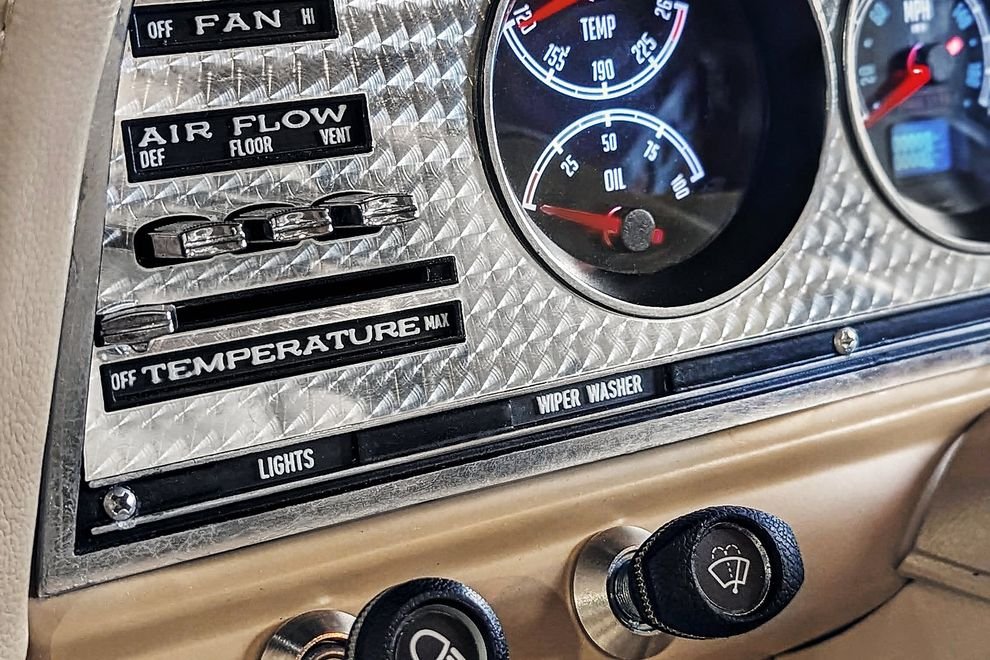 Внутри тоже проделана большая работа, соединяющая стилистику эпохи с современными технологиями, а кожаная обивка Moore & Giles, с «цветочным» рисунком, выглядит просто потрясающе. Оригинальный руль AMC Jeep – ещё один важный стилистический штрих, как и винтажный блок климат-контроля Air Magnum V, который идеально сочетается с приборной панелью. Однако лучшая её часть, безусловно, головное устройство. Использовав оригинальную аудиосистему JL, Vigilante 4х4 каким-то образом внедрила в неё Bluetooth и HD-радио, чтобы можно было наслаждаться идеальным звуком, через шесть новых высококачественных динамиков.