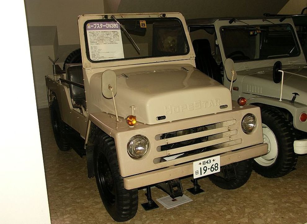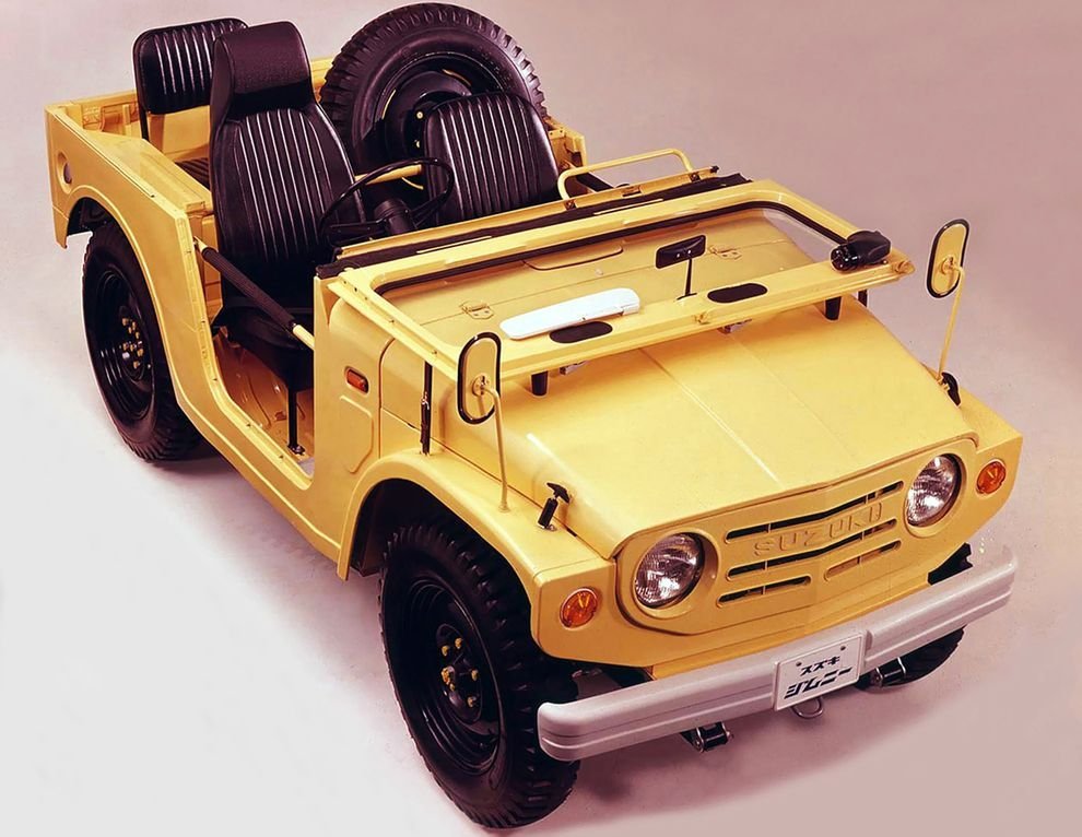 В 1965 году некая Hope Motor Company построила компактный внедорожник HopeStar ON 360, с подключаемым передним мостом. Длина машины не превышала трёх метров, а вес – 525 килограммов. Машина приводилась в движение двухтактным мотором воздушного охлаждения фирмы Mitsubishi. При рабочем объёме 359 см3 он развивал мощность 21 л. с. и скорость 70 км/ч. Серийным новый мини-вездеход стал только в 1967-м, но за год удалось продать всего пятнадцать штук. Разочаровавшись в выбранном пути, Hope Motor Company отказалась от автомобильного производства, передав права на него компании Suzuki. И в 1970 году, после серьёзных переделок, бывший HopeStar появился под именем Suzuki LJ 10 или Jimny 360. Его дизайн полностью изменился, а вот габариты остались, по сути, прежними: длина – 3 метра, ширина – 1,3 метра, да и вес увеличился незначительно – до 590 килограммов. Конструктивно новый Jimny был вполне адекватен времени: открытый кузов, с откидным задним бортом, крепился к раме, подвеска – зависимая, на рессорах, двери – тканевые на молнии, которые чуть позже заменили на более удобные, с трубчатым каркасом и обычными ручками. А чтобы уложиться, прежде всего по длине, в японский рыночный сегмент kei car, с самым низким налогом, запасное колесо разместили в салоне, отобрав место у задних пассажиров. Мощность двухцилиндрового двухтактного двигателя воздушного охлаждения всё того же объёма 359 см3, подросла до 25 л. с., а скорость – до 72 км/ч. Коробка была, естественно, механическая четырёхступенчатая.