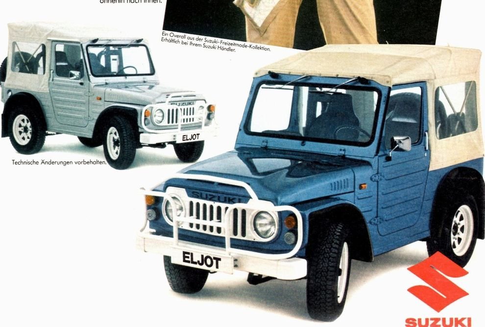 Специально для рынка США Jimny переименовали в Brute. И вообще, вниманию американцев предлагались крайне симпатичные версии с коваными дисками, сложной окраской в два тона и виниловыми наклейками, в соответствии со вкусами покупателей той или иной местности. В Германии же появилась модель Eljot, название которой было производным от литер L и J. Она часто продавалась с лебёдкой и креплениями для охотничьих винтовок или доски (для сёрфинга). Дуга безопасности шла в базе. При этом в США малыш не пошёл, а вот немцам компактный внедорожник понравился, и за полтора года, начиная с 1979-го, в ФРГ продали более десяти тысяч Eljot, что составило больше половины германского рынка внедорожников.