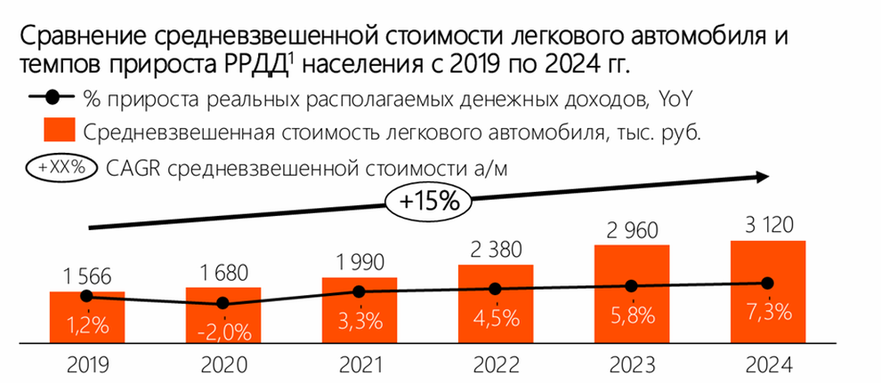 А вот покупательная способность за ростом цен не успевает. Как говорится, цены ушли, а зарплаты остались. Консалтинговая компания OKS Labs указывает на значительное увеличение разрыва между стоимостью автомобилей и доходами: с 2019 по 2024 годы рост средневзвешенной цены нового автомобиля составил почти 100%, а рост реальных располагаемых доходов – только 15% (рис. 1). Разрыв между ценами и доходами резко снизил доступность нового автомобиля.