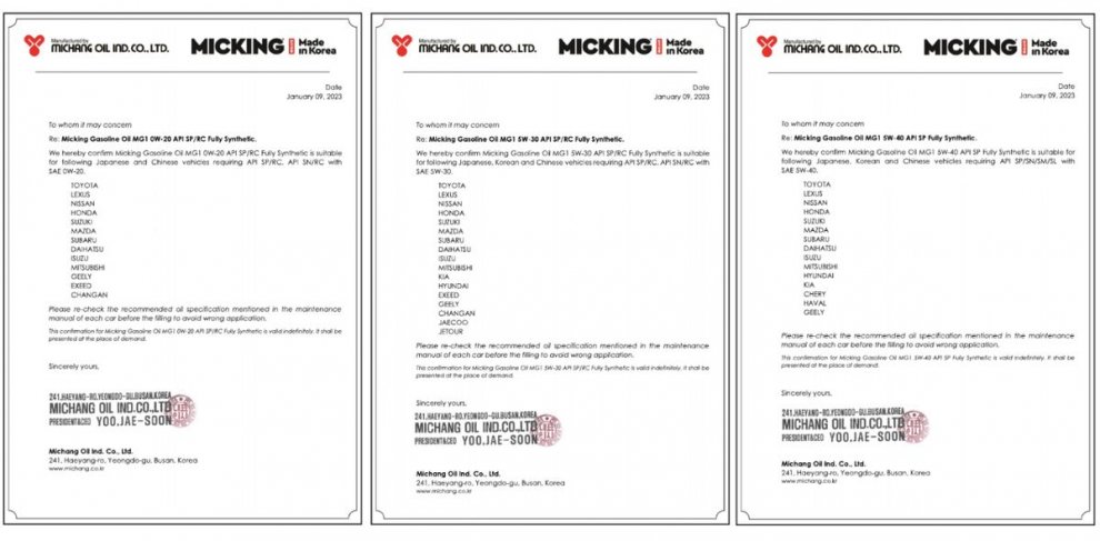 Моторное масло MICKING соответствует требованиям международных стандартов качества API, ACEA, ILSAC и JASO. Более того, инженеры создавали формулу продуктов, с учётом особенностей устройства двигателей азиатских автомобилей, что обеспечивает идеальное функционирование системы жизнеобеспечения. MICKING рекомендован к применению в автомобилях: Toyota, Lexus, Nissan, Honda, Suzuki, Mazda, Subaru, Daihatsu, Isuzu, Mitsubishi, Hyundai, KIA, Haval, Chery, Omoda и многих других.