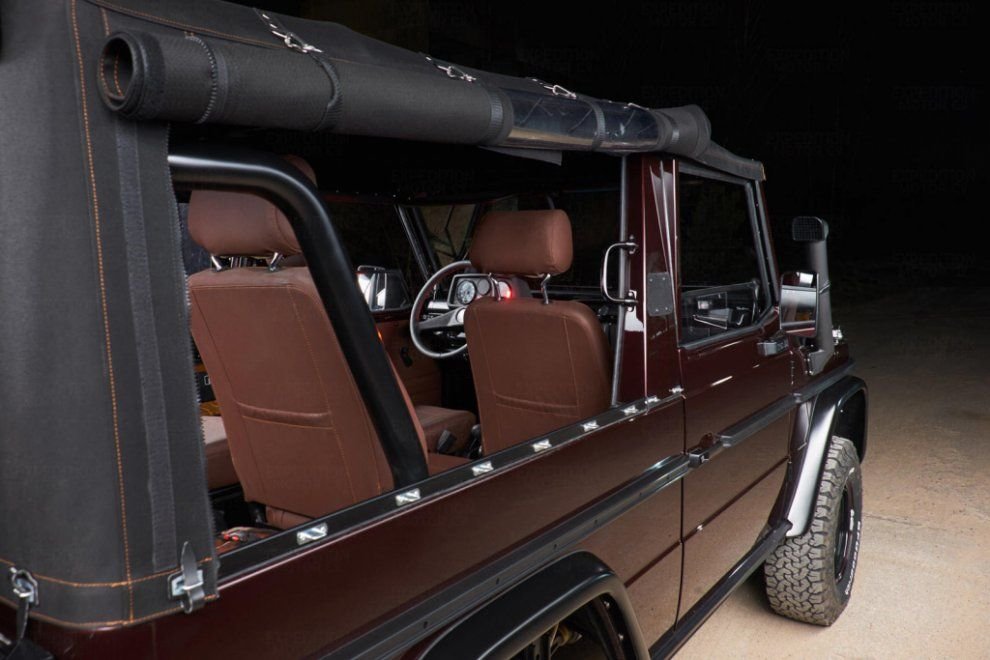 Винтажный G-класс оснащён 2.5-литровым пятицилиндровым дизельным двигателем и пятиступенчатой механической коробкой передач. В процессе реставрации он был полностью разобран, зачищен и обработан антикоррозийной грунтовкой. Вся механическая часть (включая трансмиссию, тормоза, подвеску и рулевое управление) восстановлена и обновлена до современного уровня. Интерьер дополнили коричневые виниловые кресла и дверные карты с ярко-оранжевой прострочкой. Для повышения комфорта, мастера Expedition Motor Company установили новую систему отопления, вентиляции и кондиционирования, а также мультимедиа с поддержкой Bluetooth, USB и подключаемых устройств. При этом спартанская приборная панель полностью соответствует времени оригинальной сборки. Откидное лобовое стекло и конфигурация кабриолета с мягким верхом тоже сохранились.
