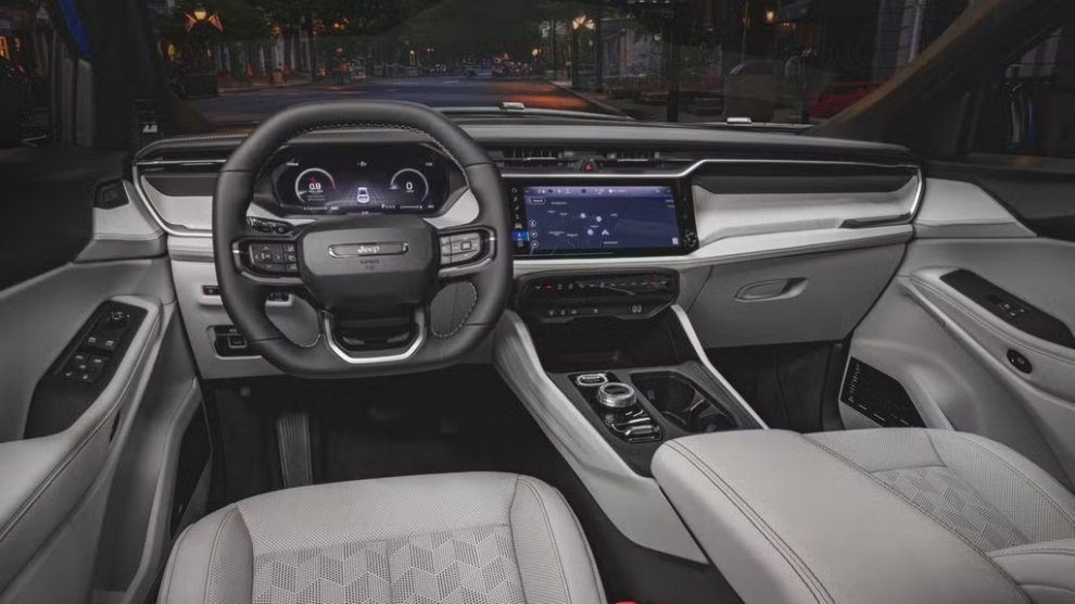 Увеличение габаритов отразилось и на внутреннем пространстве. Объём багажного отделения за вторым рядом вырос с 780 до 950 литров, а со сложенными сиденьями эта цифра достигает впечатляющих 1 935 литров (против 1 550 литров у предыдущего поколения). В отделке салона Cherokee перенял стиль старших моделей линейки. Широкая передняя панель, с верхним прозрачным экраном и нижней полкой, выглядит современно и минималистично. Цифровая приборная панель, диагональю 10,25 дюйма, сочетается с центральным 12,3-дюймовым дисплеем мультимедиа. Цветовая гамма интерьера, как и положено Jeep, сдержанная – либо чёрный, либо белый. Причём, белый возможен только в топовых комплектациях.
