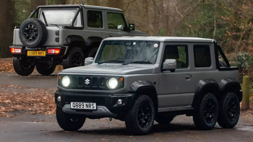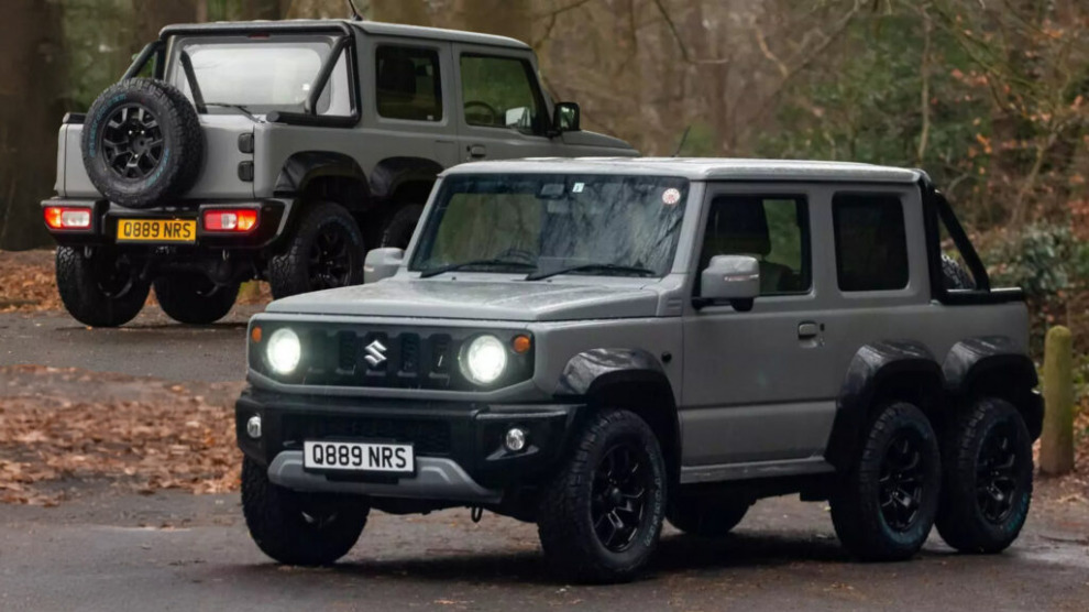 В удлинённой задней части Jimny теперь находится компактная грузовая платформа с изготовленной вручную задней дверью, а бампер и задние фонари остались от донора. Экстерьер окрасили в серый цвет Nardo от AUDI, который хорошо сочетается с чёрными молдингами и колёсами, создавая единый гармоничный образ. Внутри Jimny тоже преобразился, хотя мы бы не назвали эти изменения впечатляющими. Кресла и дверные карты просто обтянули чёрно-серой стёганой кожей, что, конечно, настоящая роскошь, по сравнению со стандартной тканью внедорожника. Новая система Kenwood заменила штатную информационно-развлекательную систему, хотя её тоже нельзя назвать высококлассной. С другой стороны, это шестиколёсный Suzuki, а не Rolls-Royce. Пробег автомобиля составляет 11 тысяч километров, а фотографии свидетельствуют о том, что он находится в идеальном состоянии.