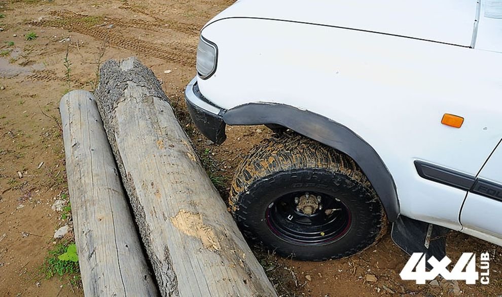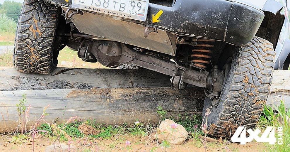 Другие, не менее важные параметры проходимости: углы въезда-съезда и, соответственно, длина переднего и заднего свесов. Они фактически дают представление о том, на какое препятствие машина может въехать и съехать без применения трапиков (сэнд-траков). Например, ступенька или крутой бугор. Однако и их можно одолеть хитростью, используя возможности зацепа шин. Например, если машина упирается бампером в высокий выступ (ступеньку, бревно), то во многих случаях можно подъехать сбоку, под углом. Вывернув переднее колесо в сторону препятствия, мы тем самым существенно уменьшаем необходимый для въезда угол, и нейтрализуем длину переднего свеса. Да и упираемся в препятствие уже не бампером, а колесом. Агрессивные плечевые ламели покрышки заползают на ступеньку, опираясь как человек локтями.