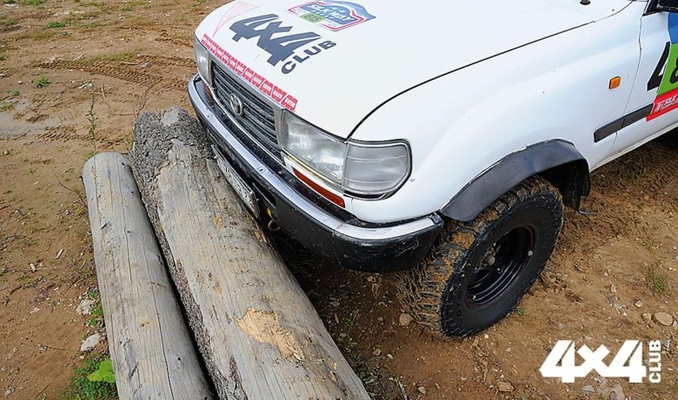 Итак, большинство геометрических препятствий, таких как ступенька, упор, канава или лежащее в лесу поперёк пути бревно, лучше атаковать под углом и преодолевать по диагонали. Кстати, что касается бревна: если его толщина превышает клиренс автомобиля, то лучше просто убрать его с дороги, используя машину как тягач. Если бревно примерно соответствует дорожному просвету – можно рискнуть, не забывая, что сталь всегда крепче дерева, но глушитель можно оторвать. Если же бревно не очень толстое, то его можно переехать, выбирая траекторию под небольшим углом. Но важно помнить, что если выбранный угол окажется слишком велик, а бревно и грунт скользкими, машина запросто может соскользнуть и бревно встанет вдоль колеи. В таком случае нужно остановиться и снизить давление в шинах, иначе так и будете вечно скользить вдоль бревна. Низкое давление и агрессивные боковые ламели грязевого протектора МТ-шины сделают своё дело, и автомобиль залезет на бревно.