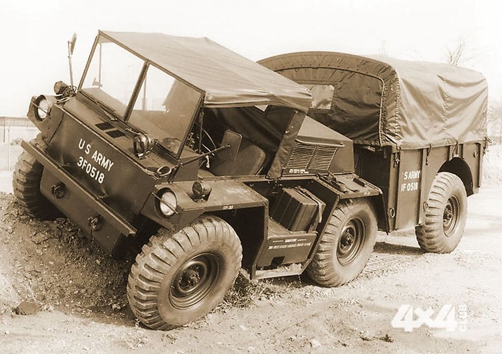 Третьим кандидатом на замену был трёхосный M561, он же Gama-Goat (1968-1973), грузоподъёмностью 1,25 тонны. Это чудо техники представляло собой забавный гибрид тягача, трактора и амфибии, по проходимости напоминая лёгкий танк, что пришлось очень кстати во Вьетнаме, где почти все боевые действия проходили в раскисших от влаги джунглях и на залитых водой рисовых полях. Название Gama-Goat намекало и на его создателя, инженера Рожэ Гамона (Roger Gamaunt), и на прыгучий (goat – «коза» по-английски) характер машины при езде по бездорожью. С точки зрения конструкции это был микроавтопоезд, состоящий из двухосного тягача и шарнирно присоединённого прицепа. Причём прицеп получил и ведущие, и управляемые колёса одновременно! Правда, его перемещения в пространстве были ограниченны – машина не могла складываться. Зато в остальном – полная свобода! Тем более, что прицеп можно было отстёгивать и менять на другой прямо в полевых условиях. Но это было ещё не всё. Автомобиль оснащался независимой рычажно-пружинной подвеской всех колёс и герметизированным алюминиевым кузовом. Это давало возможность преодолевать водоёмы вплавь со скоростью около 3 км/ч, за счёт вращения колёс. По хорошей же дороге двухтактный дизель Detroit-Diesel 3-53 (2.6 литра, 103 л. с.) разгонял амфибию до 88 км/ч. При этом трансмиссия с двухступенчатой раздаточной коробкой позволяла отключать задний и передний мосты.