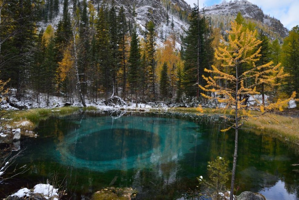 Гейзеровое озеро расположено на южном склоне Курайского хребта, в шести километрах от села Акташ (788 километр Чуйского тракта). Оно не слишком большое и глубокое, но знаменито не размерами, а уникальным, постоянно изменяющимся дном – четыре родника то и дело меняют форму голубых пятен на дне. Поверхность при этом всегда остаётся спокойной, а вода прозрачной.