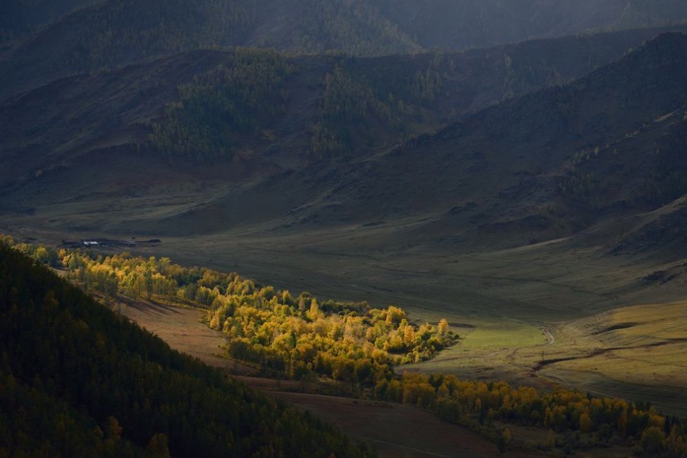 Вид с перевала Чике-Таман. Одинокий солнечный луч высветил рощу на дне ущелья. Осенью в алтайских предгорьях часто встречаются красивые рощицы сибирских лиственниц, которые необычайно ярко светятся при попадании на них солнечных лучей.