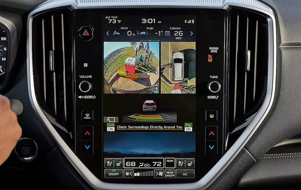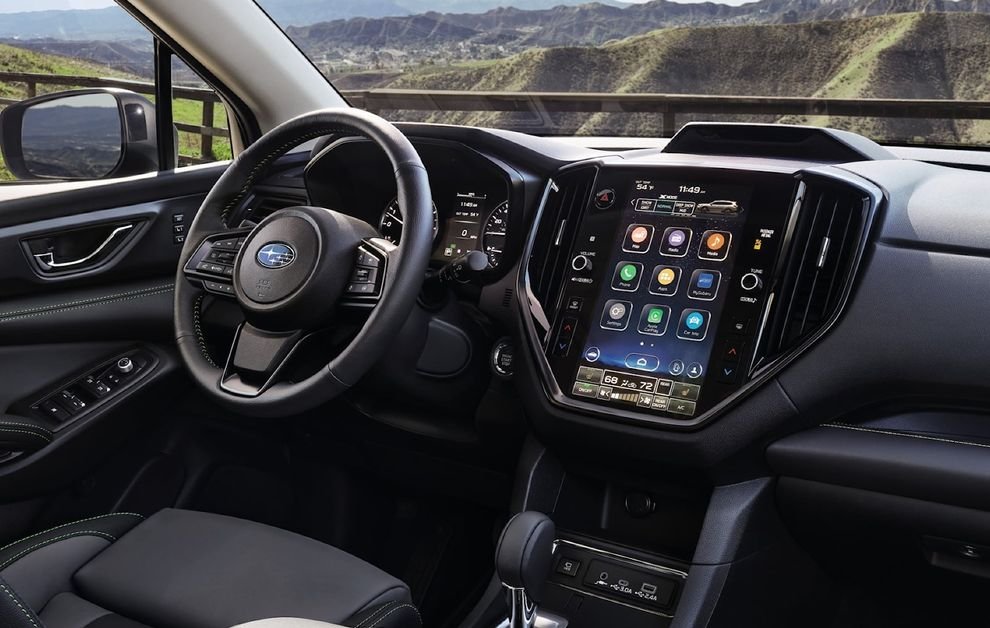 Цветной сенсорный экран мультимедиа увеличился с 8 до 11,6 дюймов, и расположен вертикально. Кроме него здесь есть электропривод и вентиляция передних сидений, подогрев второго ряда и руля, светодиодные фары, панорамная крыша, электропривод задней двери, музыкальная система Harman Kardon, а также Apple Carplay и Android Auto. Система EyeSight уже в базе позволяет отслеживать движение транспорта с помощью двух камер, контролирует положение автомобиля в полосе и, говорят, снижает вероятность аварий на 85%. Кстати, система удержания в полосе реализована весьма оригинальным образом. При приближении к краю полосы Ascent деликатно, но настойчиво вырывает руль из рук водителя и плавно возвращает машину обратно, но если по каким-то причинам водитель не даст этого сделать, то сработает индикация в виде светодиодов на передней панели, которые отражаются на лобовом стекле, напоминая приближающиеся стоп-сигналы идущей впереди машины. Эдакий бюджетный проекционный экран получается. Приборная панель по-прежнему аналоговая, с небольшим экранчиком бортового компьютера по центру.