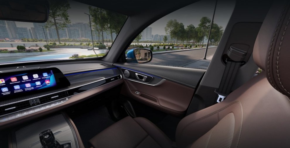 Центральное место в салоне занимает цифровая панель с двумя HD-экранами 12.3 дюйма, работающая на производительном процессоре Snapdragon 8155. Комплексное оснащение включает электрические регулировки сидений, двухзонный климат-контроль, полный зимний пакет, с обогревом практически всех поверхностей, а также функцию бесконтактного открытия багажника. Безопасность обеспечивают шесть подушек, система кругового обзора 540°, датчики парковки и комплекс электронных ассистентов, включая ABS и систему курсовой устойчивости (ESC). Телематическая система позволяет дистанционно управлять климатом в салоне, включать обогревы, запускать двигатель и отслеживать состояние автомобиля.