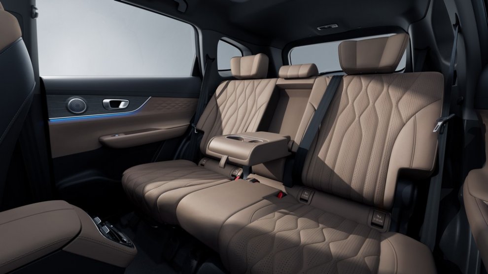 Передние кресла обтянуты эко-материалом ECO Skin, напоминающим замшу, с ромбовидной прострочкой и перфорацией. Второй ряд – широкий диван с регулируемыми спинками, а третий – складывается в пол. Компоновка 5+2 позволяет создать до 12 конфигураций салона. Объём багажника варьируется от 193 до 1 930 литров.