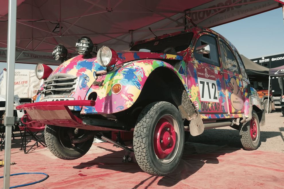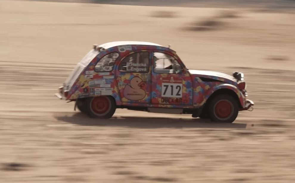 Первый из этих автомобилей меньше всего ожидаешь увидеть в пустыне. Это Citroen 2CV с лифт-комплектом, внедорожной подвеской, внешними защитными элементами и жизнерадостной окраской. Хотя, если вспомнить, что это одна из самых надёжных машин в истории, следует признать, что его пилоты сделали правильный выбор. Раллийный 2CV, за раскачивающуюся подвеску прозванный «Уткой», управлялся гонщицами из Чехословакии. Мощность его 650-кубового двигателя составляет всего 35 лошадиных сил, что, конечно, маловато, учитывая с каким рельефом и расстояниями имеют дело участники.