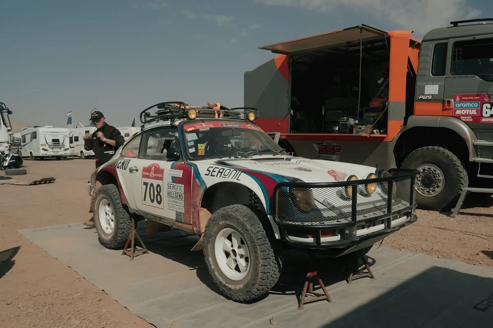 Третья машина – классический Porsche 911. Точнее, оригинальный Porsche 911 Safari 1986 года (G-серии) – прародитель современного Porsche 911 Dakar. Интересно, что он не первый раз участвовал в пустынной гонке, а вот использующие его пилоты (отец и дочь) – были новичками «Дакара».