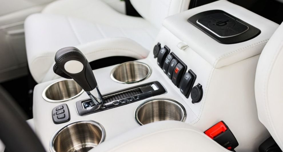 Пугающе белый интерьер решён в конфигурации 2+2. Как в первом, так и во втором ряду стоят подогреваемые кресла Recaro Cross Sportster CS, обтянутые кожей. Этой же белой кожей покрыты передняя панель, дверные карты и трансмиссионный туннель. В салоне, для контраста, используются чёрные резиновые коврики, рулевое колесо Nardi Challenge, немногочисленные переключатели, информационно-развлекательная система Sony и динамики Infinity Kappa. Среди дополнительных функций: Bluetooth, Wi-Fi, парковочные датчики, передняя и задняя камеры, контроль слепых зон и беспроводная зарядка. Окончательная стоимость восстановления этого яркого Defender неизвестна, но она наверняка неподъёмна.