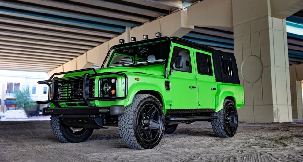 В дополнение к V8 в E.C.D. поставили на Defender усиленные мосты, регулируемую подвеску Air Ride, тормоза Brembo и выхлоп из нержавеющей стали Borla. Довольно стандартный и довольно дорогой набор. А вот что касается экстерьера, то внедорожник не просто покрашен в Verde Mantis, а использует матовую версию этого удивительного цвета. С зелёным контрастирует чёрная мягкая крыша. Тюнер также поставил колёсные диски Kahn, классическую решётку радиатора Land Rover, передний бампер, со светодиодными ходовыми огнями, и новый задний бампер.