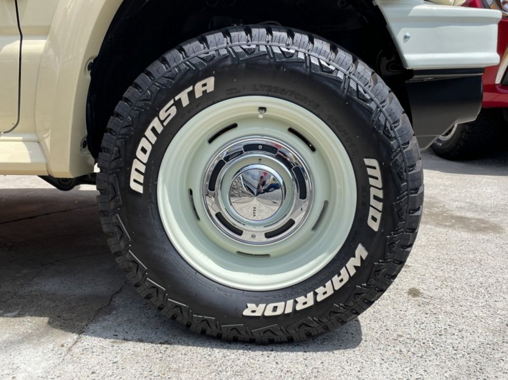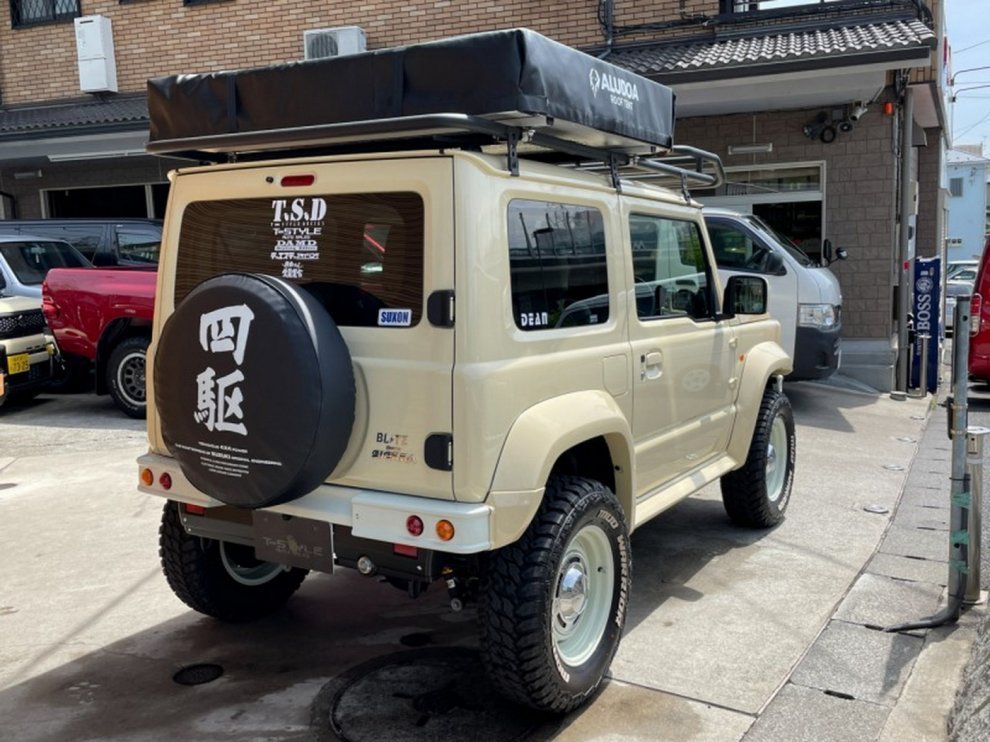 Jimny окрашен в цвет слоновой кости, в сафари-стиле. Того же цвета расширители колёсных арок и боковые пороги. 16-дюймовые колёсные диски Crimson Dean, подчеркивающие ретро-стиль, обуты во внедорожные Monster Mad Warrior 235/70 R16, а подвеска модернизирована и обеспечивает увеличение дорожного просвета на 38 мм. Кроме того, на крыше установлен большой металлический багажник, на котором достаточно места для палатки Alludoa, а также дополнительного багажа и туристического снаряжения.