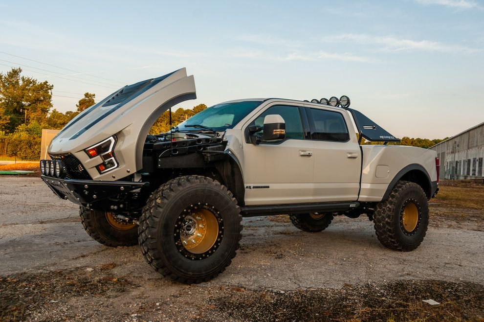 Каждый MegaRaptor начинается с серийного Ford F-250 Super Duty, который постепенно преображается. Капот, передние крылья и кузовные панели грузового отсека – демонтируются. Новый капот-раскладушка устанавливается на петлях от грузового Freightliner. Сделанный из толстого стекловолокна, он опирается на два мощных газовых амортизатора, удерживающих его в поднятом положении. Из такого же толстого стекловолокна изготавливаются и задние крылья.