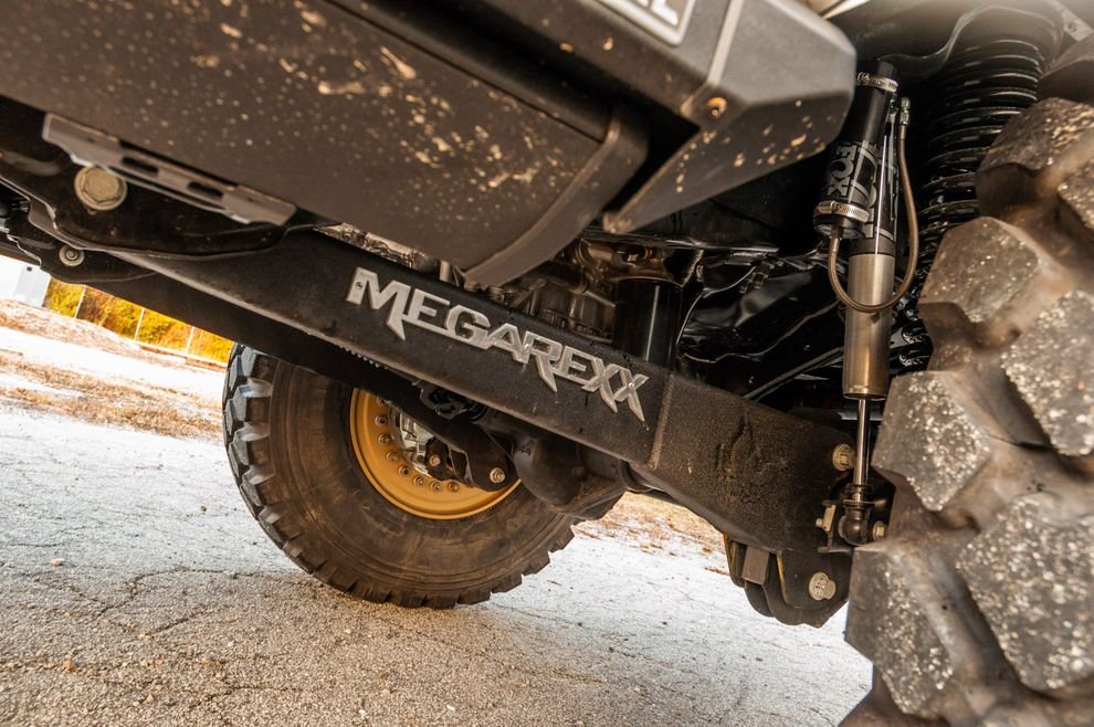 Трансформация MegaRaptor увеличивает его ширину почти до двух с половиной метров (2,47), что на 30 сантиметров шире серийного F-150 Raptor, и на 43 сантиметра шире серийного F-250. В общем, это всё равно что сравнивать молодого Дуэйна «Скалу» Джонсона в начале рестлинг-карьеры, с его нынешними размерами. Такая ширина необходима для размещения 18-слойных 46-дюймовых мега-шин Michelin X (на алюминиевых 20-дюймовых дисках), которые используются исключительно на военной технике, защищённой от подрыва (MRAP). Каждое состоящее из трёх частей колесо с диском весит больше двухсот килограммов. Для их крепления к стандартным ступицам Super Duty, добавляются алюминиевые переходники. Благодаря огромным шинам и 12-сантиметровому лифту подвески, дорожный просвет «Мега-Раптора» достигает 23 сантиметров, что больше чем у серийного F-250 (21,6 см). Такое увеличение высоты, должно превратить посадку в MegaRaptor в акробатический трюк, но мощные подножки Amp XL с электроприводом, помогают сделать это за один шаг. При этом заводская подножка, установленная на задней двери, стала практически бесполезна, и чтобы забраться в кузов нужно сильно постараться.