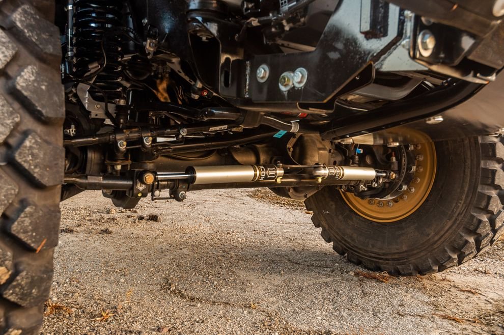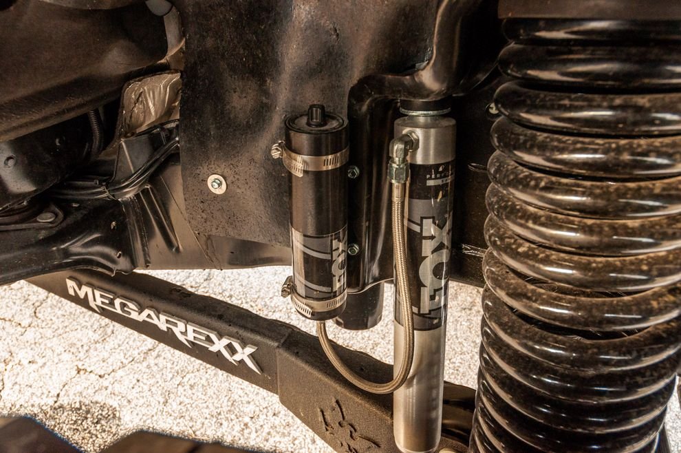 Подвеску оснастили пружинами Carli и двухдюймовыми амортизаторами Fox с байпасными резервуарами. Передние рычаги удлинили и слегка развернули, для правильного угла наклона больших колёс. Рулевое управление дополнили стабилизатором с двойными демпферами Icon. Однако несмотря на то, что команда тюнеров внесла максимально возможные изменения в конструкцию рамы, шины все равно слегка трутся при полностью вывернутом руле.